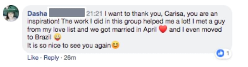 "I'm happy to be in this challenge group. It's pure love. Because of the courage I gained in this challenge, I just flirted in the coffee shop! Thank you, Carisa. What you do is a light in the world!"